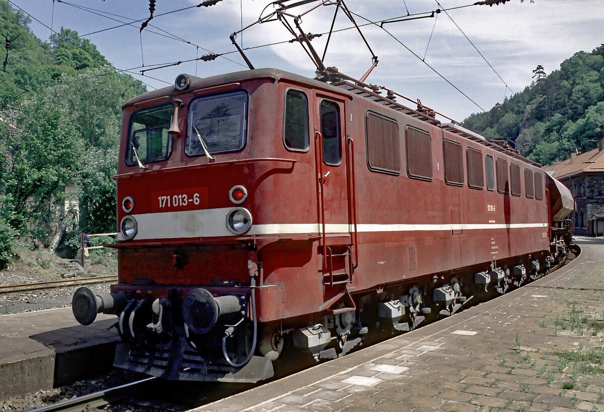 171 008 in verkehrsroter Lackierung in Doppeltraktion mit einer weiteren Lok der BR 171 am 03.11.2001 auf der Rübelandbahn bei Elbingerode.