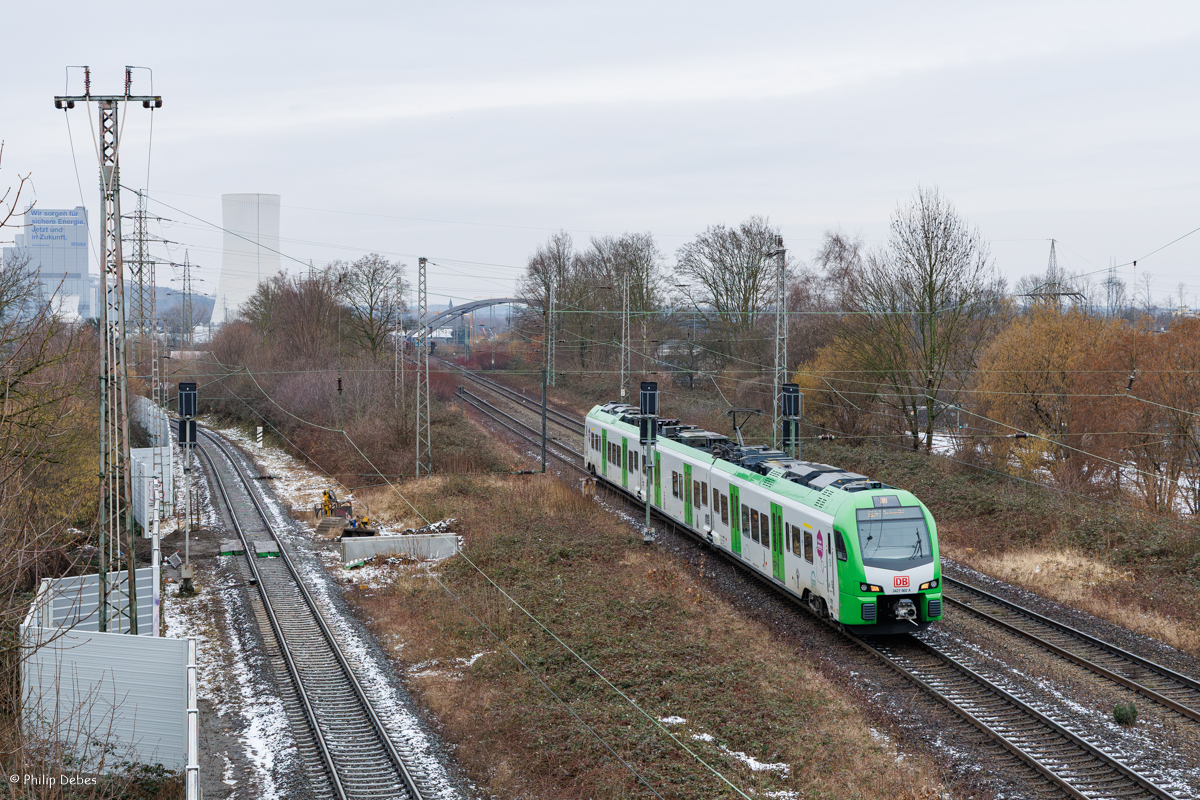 Die beiden aneinandergekoppelten DB-Elektrotriebzüge 1428 004 und 1428 005 sind hier Ende September 2025 auf der Duisburg-Hochfelder Eisenbahnbrücke zu sehen. Christian Bremer
