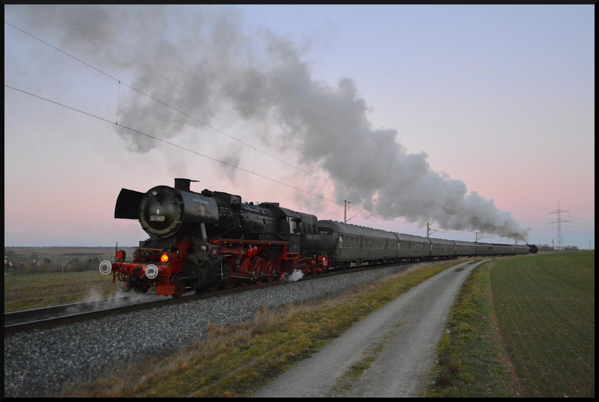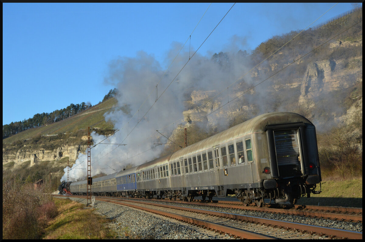 Eurovapor 77 250 mit dem GleisGlück-Sonderzug am 28.12.2025 bei Km 3,2 nahe Zeuzleben auf der Werntalbahn. Hier der Nachschuss auf die etwas kraftlos am Zugschluss hängende Dampflok 52 7409 der DGEG. Der Zug hatte zuvor außerplanmäßig in Mühlhausen rund 30 Minuten gehalten, bevor die Reise mit der entsprechenden Verspätung weiterging. Matthias Kümmel