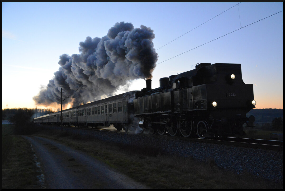 Eurovapor 77 250 mit dem GleisGlück-Sonderzug am 28.12.2025 bei Km 3,2 nahe Zeuzleben auf der Werntalbahn. Am Zugschluss hing die Dampflok 52 7409 (DGEG). Matthias Kümmel