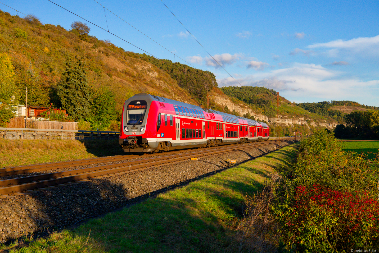 Kurz nach Sonnenuntergang durchquert ein Twindexx mit dem RE 4625 (Frankfurt (Main) Hbf - Bamberg) bei Gambach das Maintal, 07.10.2021 Korbinian Eckert