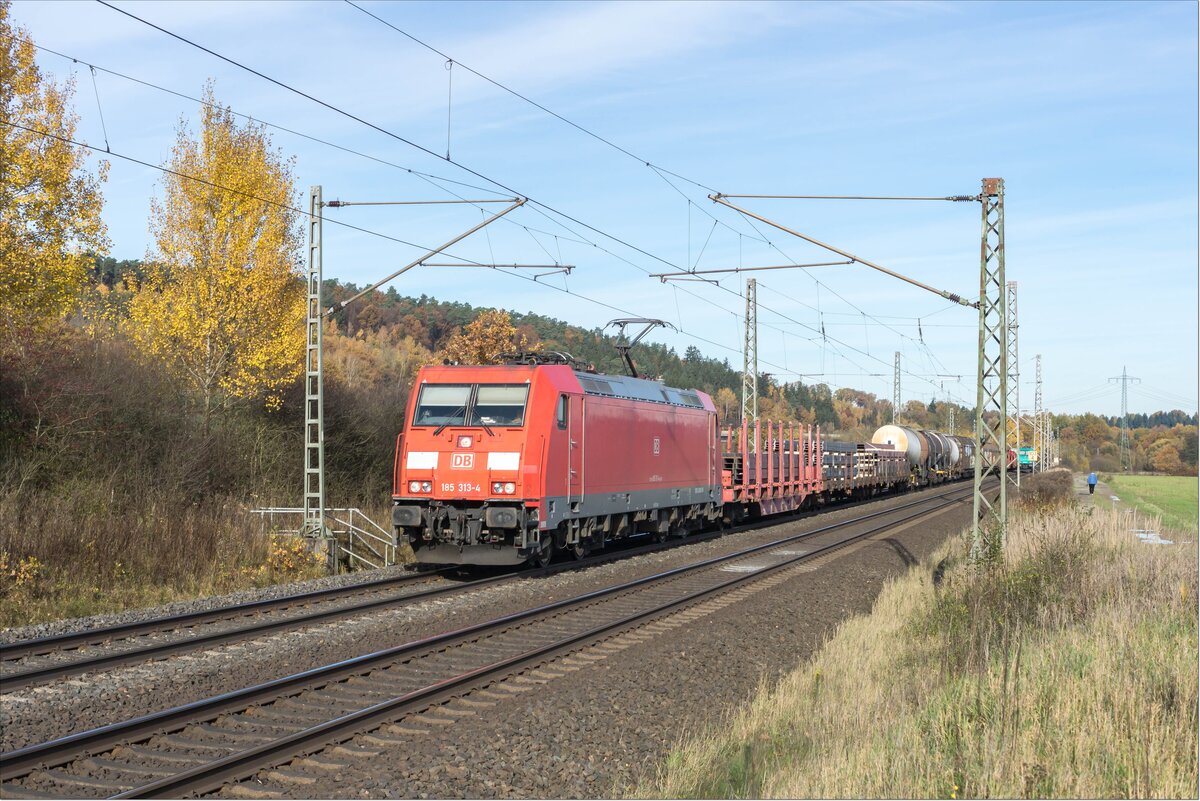185 313-4 ist mit einem gemischten Güterzug am 05.11.2025 bei Kerzell unterwegs.