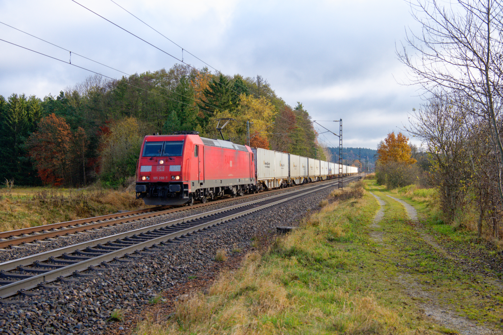 185 271 DB Cargo mit einem KLV-Zug bei Steinach bei Rothenburg Richtung Ansbach, 09.11.2021