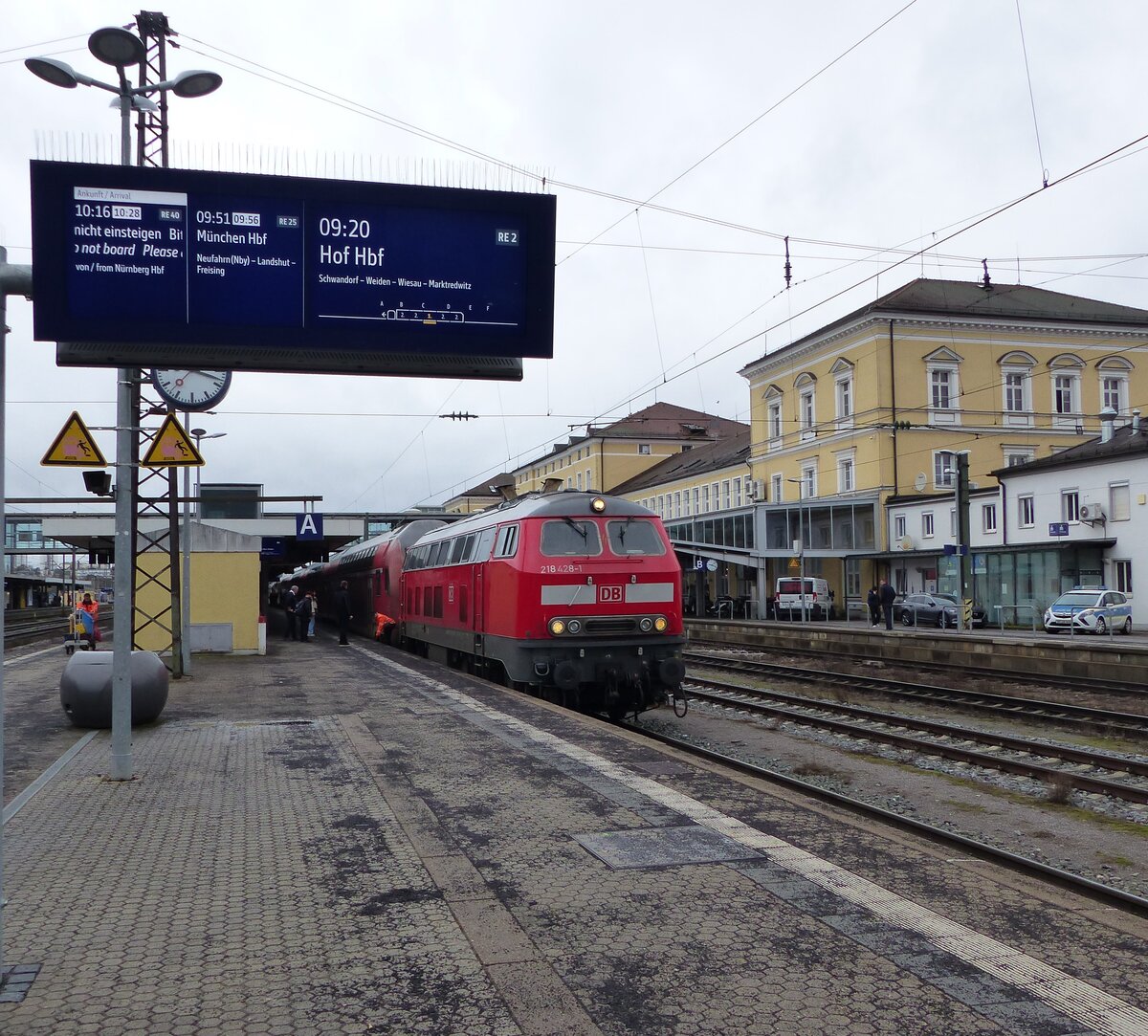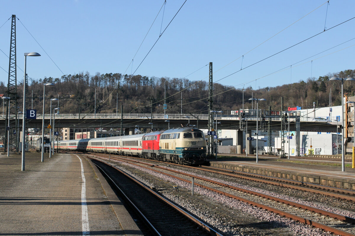 Mit einer Verspätung von rund 30 Minuten fährt der IC 2013, bespannt mit 218 446-3 und 218 411-7, in den Bahnhof Plochingen ein. (26.02.2026) Leonhard Groß
