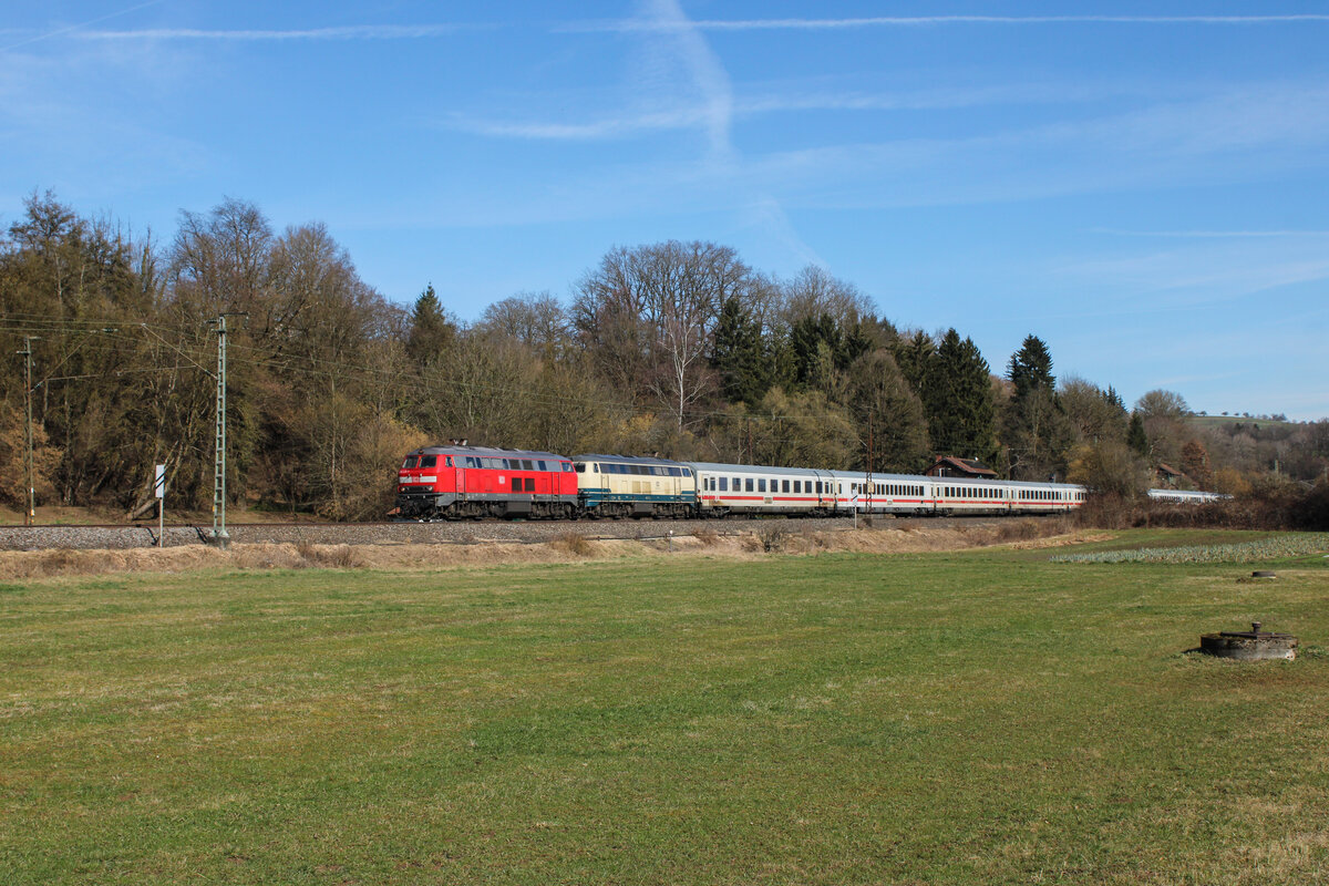 Mit einer leichten Verspätung rollen 218 411-7 und 218 446-3 mit dem IC 2012 am Haken bei Reichenbach Richtung Stuttgart, wo eine Lokomotive der Baureihe 101 den Zug übernehmen wird. (26.02.2026) Leonhard Groß