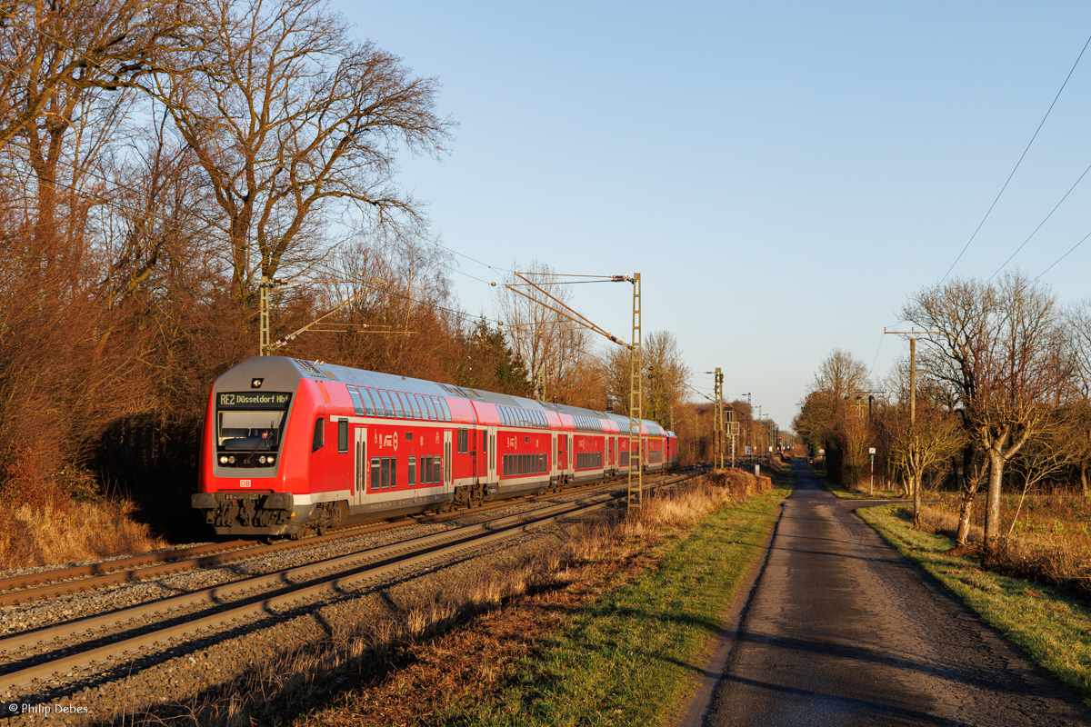 Da die Anzahl an Ersatzzügen in NRW angestiegen ist, musste TRI im Laufe des Jahres Fahrzeuge von DB Gebrauchtzug anmieten. Nach langer Zeit sind dadurch wieder rote Doppelstockwagen zwischen Hamm und Düsseldorf als RE3 im Einsatz. Am Ende schiebt 111 131. Oktober 2025 Bern hard