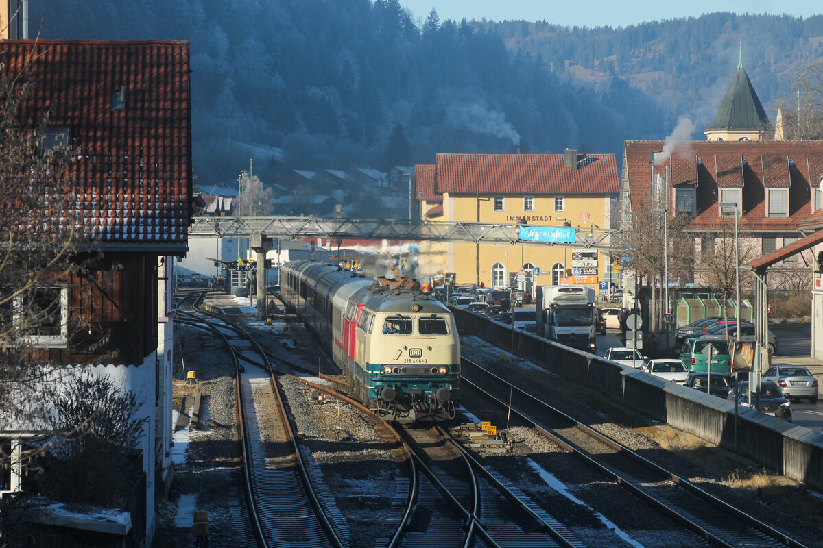 Und los geht's für 218 446 und 218 411 mit dem IC 2012. 218 411 schob den Zug von Oberstdorf bis Immenstadt, wo 218 446 sich an die Zugspitze setzte. Wenig später konnte die Ausfahrt aus Immenstadt von meiner Wenigkeit fotografisch festgehalten werden. (29.12.2025) Leonhard Groß
