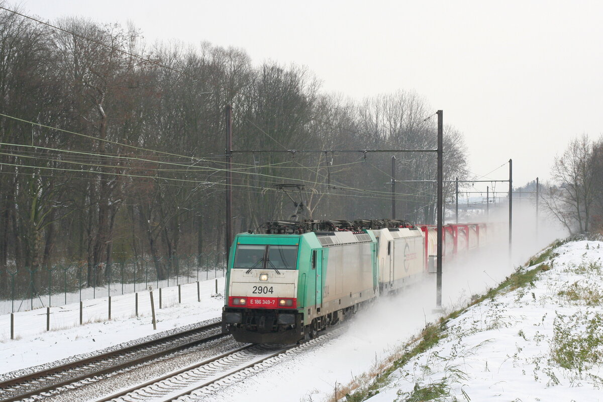 Belgiën Lok 2904/186349 von SNCB zieht lok 186161 vom ECR und einem Containerzug nach Antwerpen, im Mortsel 2/12/2010