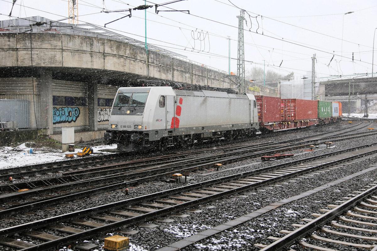 AKIEM 186023 kommt hier am 13.2.2026 um 13.04 Uhr mit einem Containerzug aus dem Hafengebiet in Hamburg und erreicht hier den Bahnhof Hamburg-Harburg. Gerd Hahn