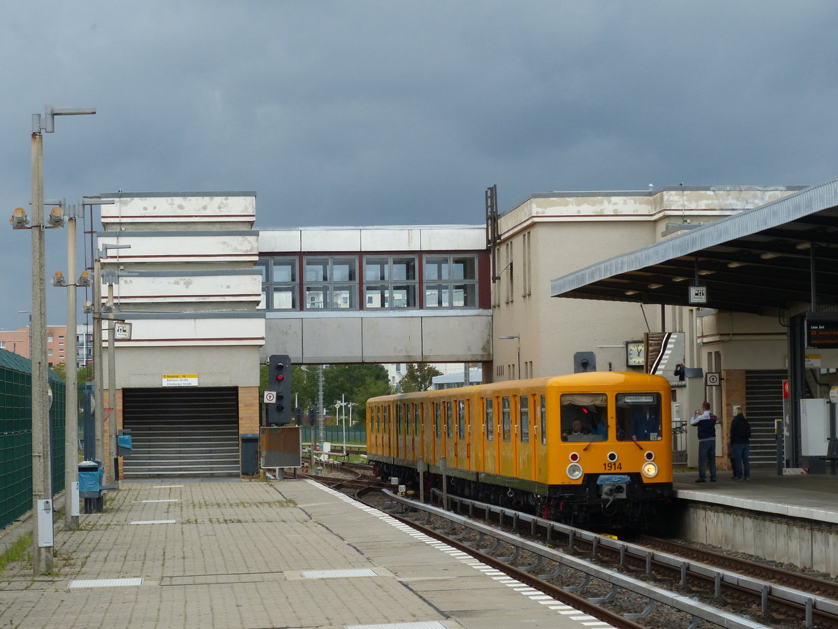 Nachschuss auf den restaurierten Zug des Typs E III der Berliner U-Bahn bei der Ausfahrt aus dem S + U-Bhf. Wuhletal am 30.09.2017. Die BVG schreibt dazu: Die Baureihe EIII ist gleichermaßen ein Kuriosum in der historischen U-Bahnflotte wie ein Zeugnis der Berliner Teilung. Nachdem der Versuch der DDR gescheitert war, für den Einsatz auf der damaligen Linie E (heute U5) eigenständig eine neue Baureihe E zu entwickeln, wurde auf ausgemusterte S-Bahnwagen als Rohmaterial zurückgegriffen. Für die Produktion der Baureihe EIII wurden vor allem die Drehgestelle und die Steuerung (z.B. Fahrschalter, Schaltwerk) der ehemaligen S-Bahnwagen verwendet. Insgesamt wurden 86 Einheiten so gebaut. Noch bis 1994 war die Baureihe regulär im Einsatz. Klaus Böttcher