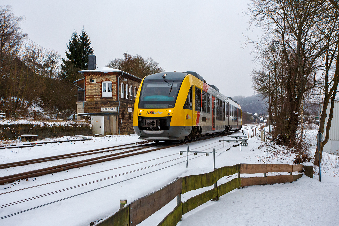 Der VT 256 (95 80 0648 156-7 D-HEB / 95 80 0648 656-6 D-HEB), ein Alstom Coradia LINT 41 der HLB - Hessische Landesbahn (3LänderBahn) verlässt am 07 Januar 2026, als RB 96 „Hellertalbahn“ (Betzdorf/Sieg – Herdorf – Neunkirchen/Siegerland), den Bahnhof Herdorf und fährt weiter in Richtung Neunkirchen. Hier passiert er gerade das Stellwerk Herdorf Ost. Der Dieseltriebzug wurde 2004 unter der Fabriknummer 1188-006 von ALSTOM Transport Deutschland GmbH (vormals LHB) in Salzgitter-Watenstedt gebaut und als VT 256 an die vectus Verkehrgesellschaft mbH geliefert. Mit dem Fahrplanwechsel am 14.12.2014 wurden alle Fahrzeuge der vectus dann Eigentum der HLB.
