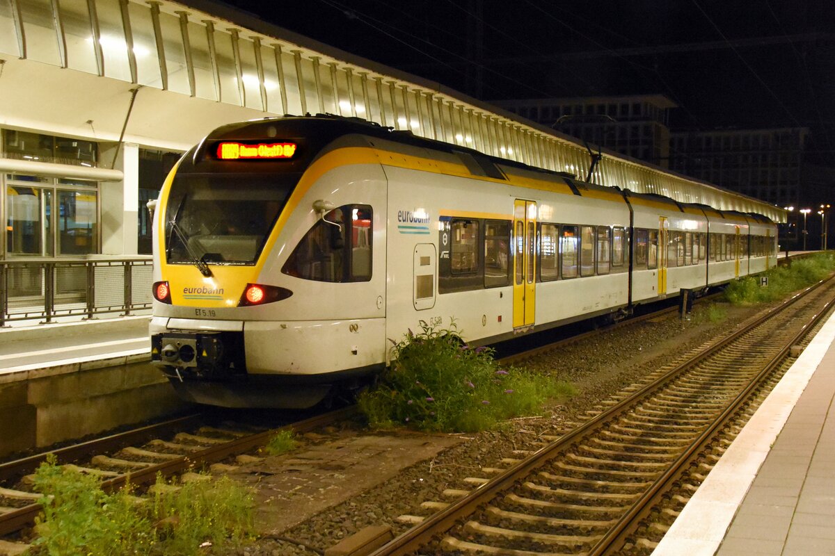 Der Elektrotriebzug ET 7.04 der Eurobahn bei der Einfahrt in den Hauptbahnhof Oberhausen, so gesehen Ende September 2025.