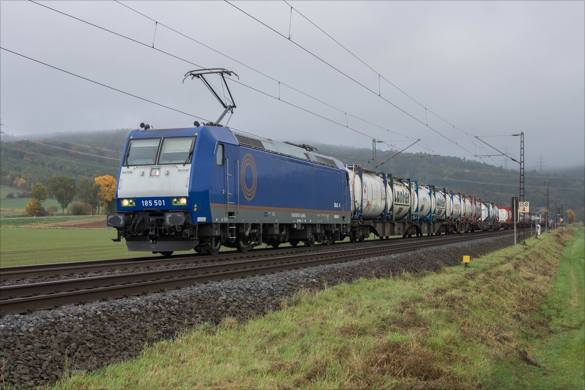 Die an die Viking-Rail ApS (mit Sitz im dänischen Padborg) vermietete 185 407-4 (91 80 6185 407-4 D-BRLL) der BRLL - Beacon Rail Leasing GmbH (Grünwald) fährt am 10 Januar 2025 mit einem Tank-Containerzug durch Betzdorf (Sieg) in Richtung Köln.