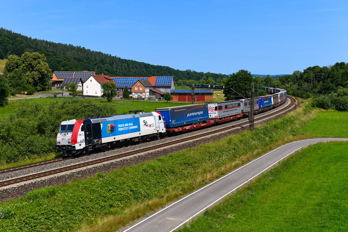 Unter der unüblichen Zugnummer DGS 59849 verkehrte am 21. Juni 2025 der von der an diesem Tage von der 185 665 gezogene Paneuropa und Terratrans KLV von Bremen Grolland nach München Ost. Am bekannten Ortsblick auf Hermannspiegel im osthessischen Haunetal konnte ich den Zug dokumentieren. Eine feste Größe auf der Nord-Süd-Strecke, praktisch täglich lassen sich Leistungen dieser Art dort beobachten. Die Verbindung von und nach Norditalien ist seit Jahrzehnten etabliert, die Züge sind auch zumeist bis auf die "letzte Tasche" beladen. Christoph Schneider