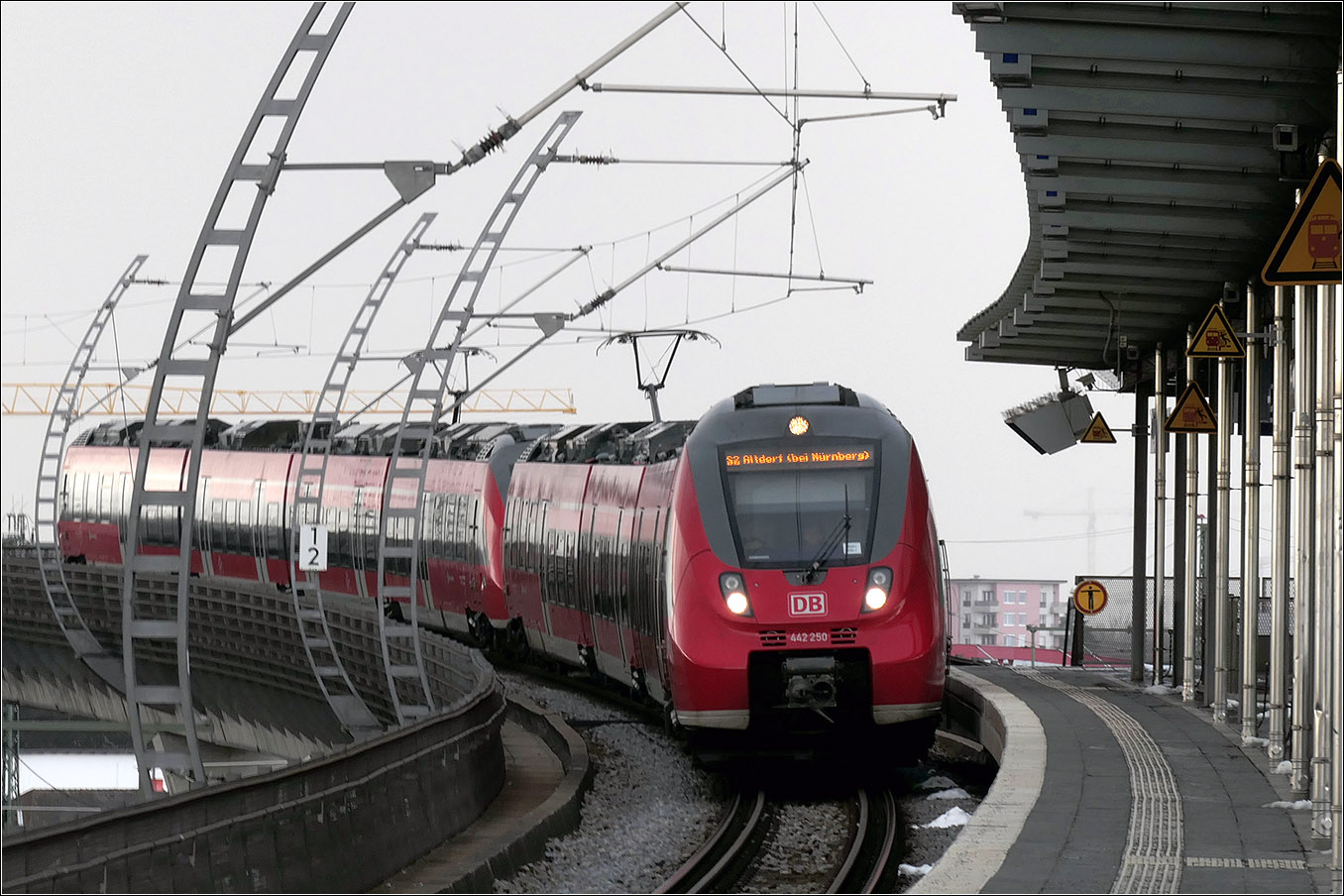 Der S-Bahnhof Nürnberg-Steibühl - Nochmals die Einfahrt von Talent 2 442 450 auf der oberen Bahnsteigebene. Hier habe ich den Schnitt so gewählt, dass nur die bogenförmigen Fahrleitungsmasten im Bild sind. Allerdings musste ich einen störende kleinen Teil des Auslegers eines Hochspannungsmast wegstempeln. Mal sehen ob bei einem zweigleisigen Ausbau wiederum die Bogenmasten verwendet werden und ob die sich dann aufgrund der gegenläufigen Bögen und der Krümmung der Brückenstrecke die Überlagerungen noch ungünstiger werden. 16.02.2026 (M)