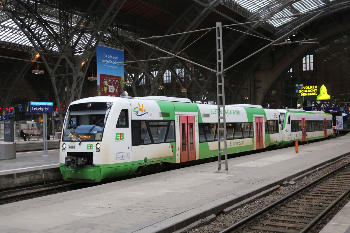 Die EB am Bahnhof in Weida, mit dem VT 316. Hier wird der Zug geteilt, Einteil fährt weiter nach Hof und der 2 teil fährt weiter nach Saalfeld. Das Bild ist am 09.03.2025 entstanden.