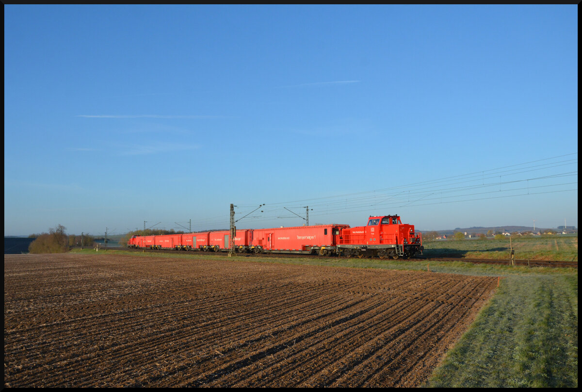 Der Würzburger Tunnelrettungszug (TRZ) am 08.03.2026 bei seiner wöchentlichen Bewegungsfahrt nach Lohr Bahnhof. Standardmäßig sind zwei Lokomotiven der Baureihe 714 an diesem Spezialzug. Die Lok 714 107 (NVR: 9980 9 170 007-5 D-DBMP) schiebt den von ihrer Schwester 714 109 (NVR: 9980 9 170 009-1 D-DBMP) angeführten Zug auf der 1.232 Meter langen Leinachtalbrücke (SFS Hannover - Würzburg) nach.