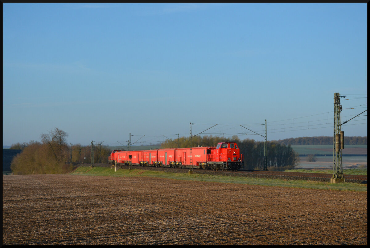 Der Kornwestheimer Tunnelrettungszug (TRZ) am 02.04.2026 bei einer Überführungsfahrt nach Fulda. Standardmäßig sind zwei Lokomotiven der Baureihe 714 an diesem Spezialzug. Die Lok 714 xxx (NVR: 9980 9 170 xxx-x D-DBMP) führt den Zug bei Geroldshausen über die Frankenbahn, während ihre Schwester 714 xxx (NVR: 9980 9 170 xxx-x D-DBMP) am anderen Ende nachschiebt. Matthias Kümmel