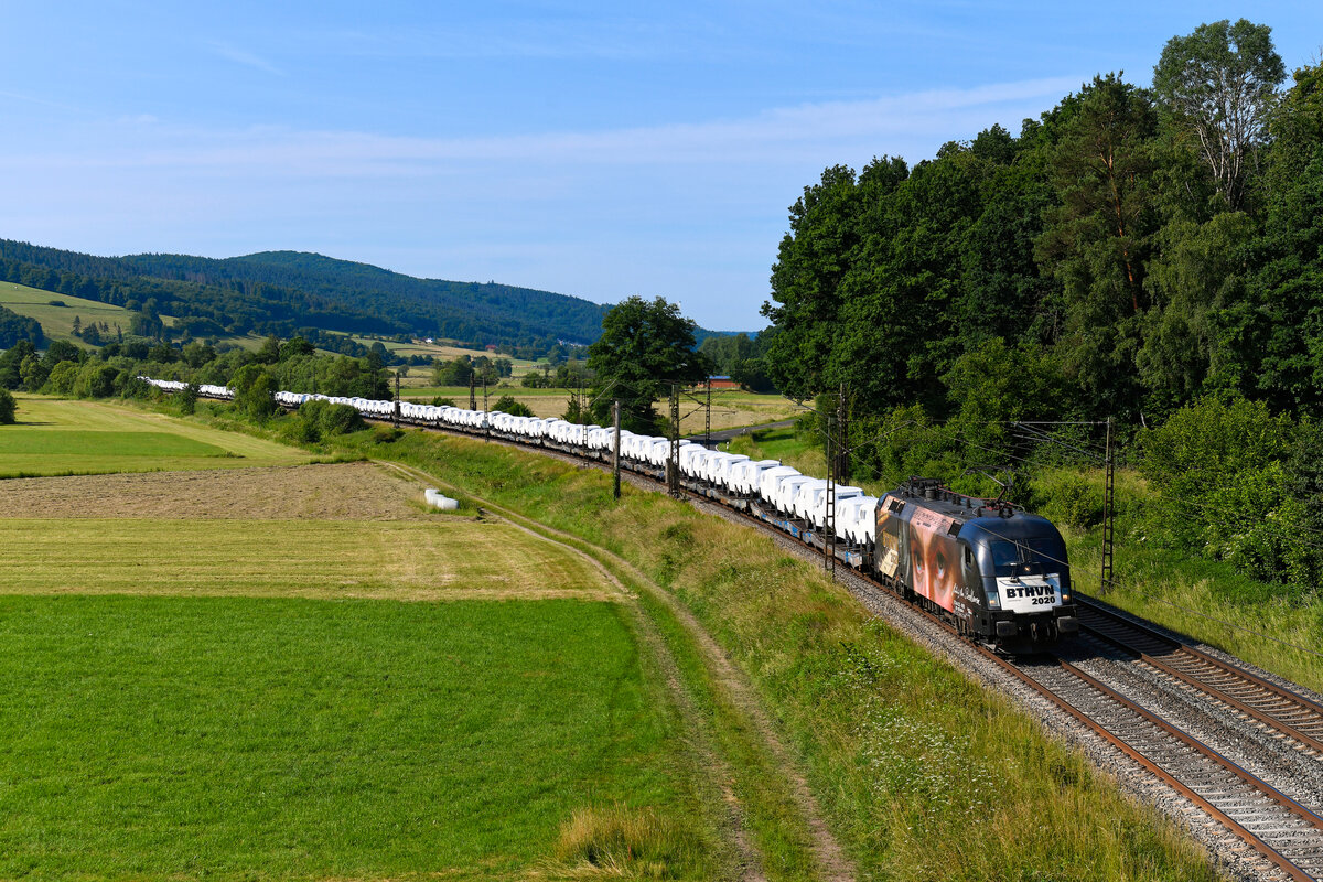 Mit einer Ladung fabrikneuer G-Klassen von Mercedes-Benz für den Export nach Übersee war am Morgen des 21. Juni 2025 der "Beethoven-Taurus" unterwegs. Unter der Zugnummer DGS 48936 war der Laufweg von Graz Ost nach Bremerhaven Speckenbüttel. Die inzwischen zum Bestand von Beacon Rail Leasing gehörende 182 510 war zum Aufnahmezeitpunkt für die Steiermarkbahn im Einsatz, unter deren Regie diese Leistung erbracht wird. Bei Odensachsen im osthessischen Haunetal konnte ich den einheitlich beladenen Autotransportzug in seiner gesamten Länge dokumentieren. Christoph Schneider