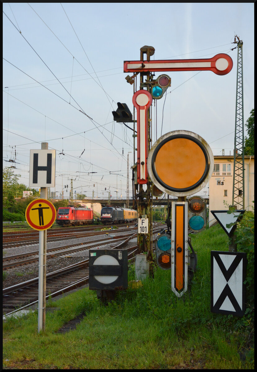 Nostalgiebahnhof Hanau Hbf: Das Formsignalsammelsurium im Südteil des Hanauer Hauptbahnhofes gleicht dem in einem Museum. Eigentlich sollten die historischen Signale, wie bereits im Nordteil des Hauptbahnhofes, seit den 1990er Jahren verschwunden sein. Aber auf Grund von Sparmaßnahmen tun sie nach wie vor zuverlässig ihren täglichen Dienst.