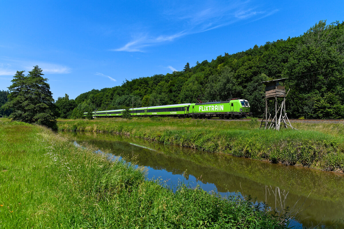 Am 20. Juni 2025 bespannte die im Flixtrain-Design gehaltene 193 435 der ELL den FLX 1243 nach Stuttgart HBF. Zwischen Neukirchen und Hünfeld passierte sie einen idyllisch gelegenen Jägerstand am Ufer der Haune. Christoph Schneider