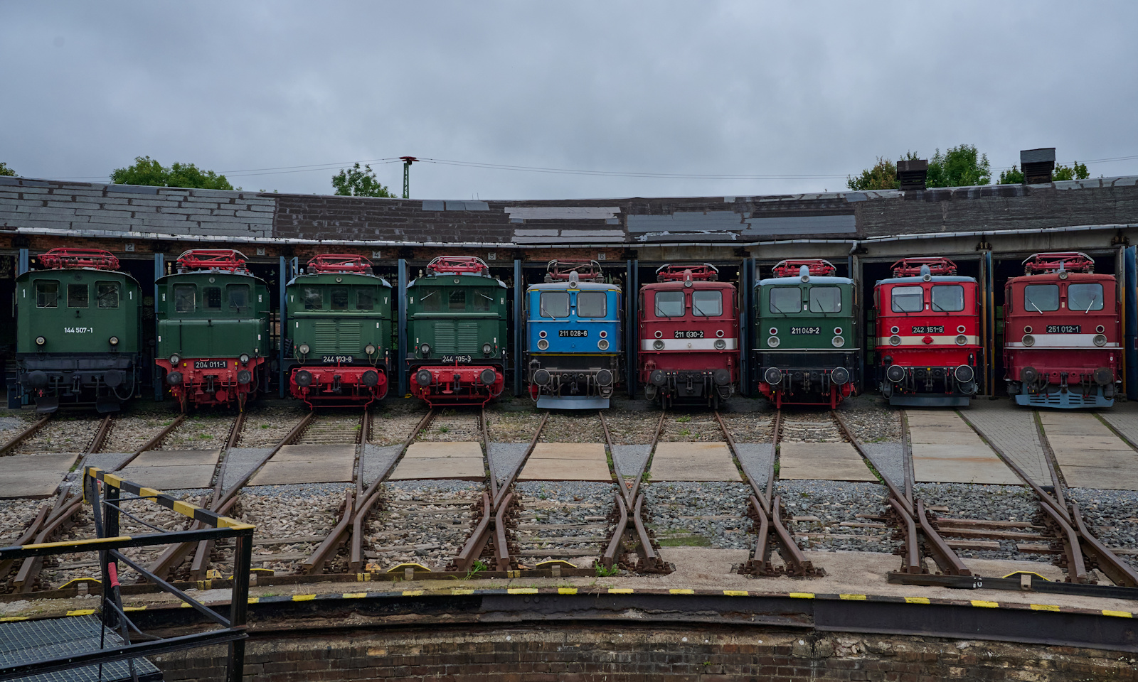 Parade einiger E-Loks des Thüringer Eisenbahnvereins. Am 26.07.2025 waren 144 507, 204 011, 244 103 und 105, 211 028, 211 030 und 049, 242 151 und 251 012 vor dem Lokschuppen in Weimar ausgestellt. Anlass war das Sommerfest des Vereins. Michael Brunsch