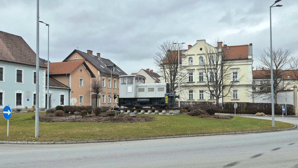 Die "Kreisellok" direkt vor dem Bahnhofsgebäude Köflach, eine ...
