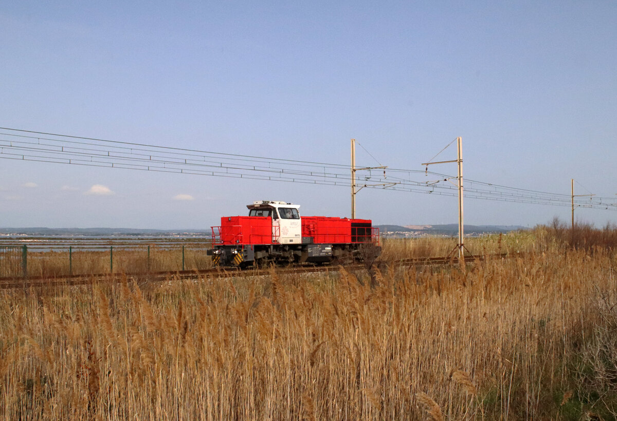 Diesellok in der weiten Landschaft auf dem 'Damm' ...