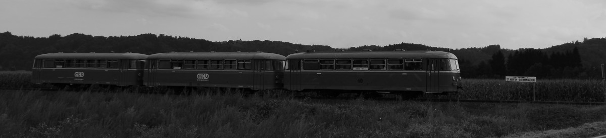 Ein markantes quitschen , das unverkennbare Motorengeräusch und mit einer älteren im Rollstuhl sitzenden Dame in Erinnerungen der längst vergangenen Zeiten zu schwelgen in denen der Ürdinger durchs Sulmtal rollte sind wohl die schönsten Anzeichen dafür das der "Rote Blitz " gleich um die Kurve rattert. An diesem Wochenende war es wiedereinmal so weit das die legendäre Sulmtalbahn mit großer Unterstützung der Graz Köflacher Eisenbahn und der Interessengemeinschaft "Freunde der Sulmtalbahn" befahren werden konnte. Hier zu sehen VT10.02,VB10.02 und VB10.12 kurz vor Gasselsdorf am 30.08.2014 Karl Heinz Ferk