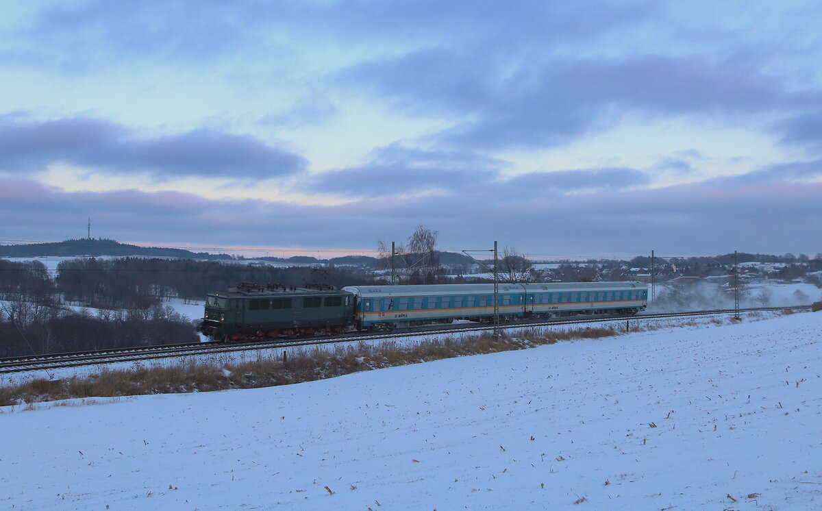 Am 08.01.2026 fuhr die E11 der Press mit 2 Alexwagen von Leipzig nach Plauen als Schulungsfahrt für neue Lokführer. Die E11 alias 211 013 wurde hierbei kurz vor Dunkelheit bei Ruppertsgrün/Pöhl aufgenommen. Andreas Schreiber