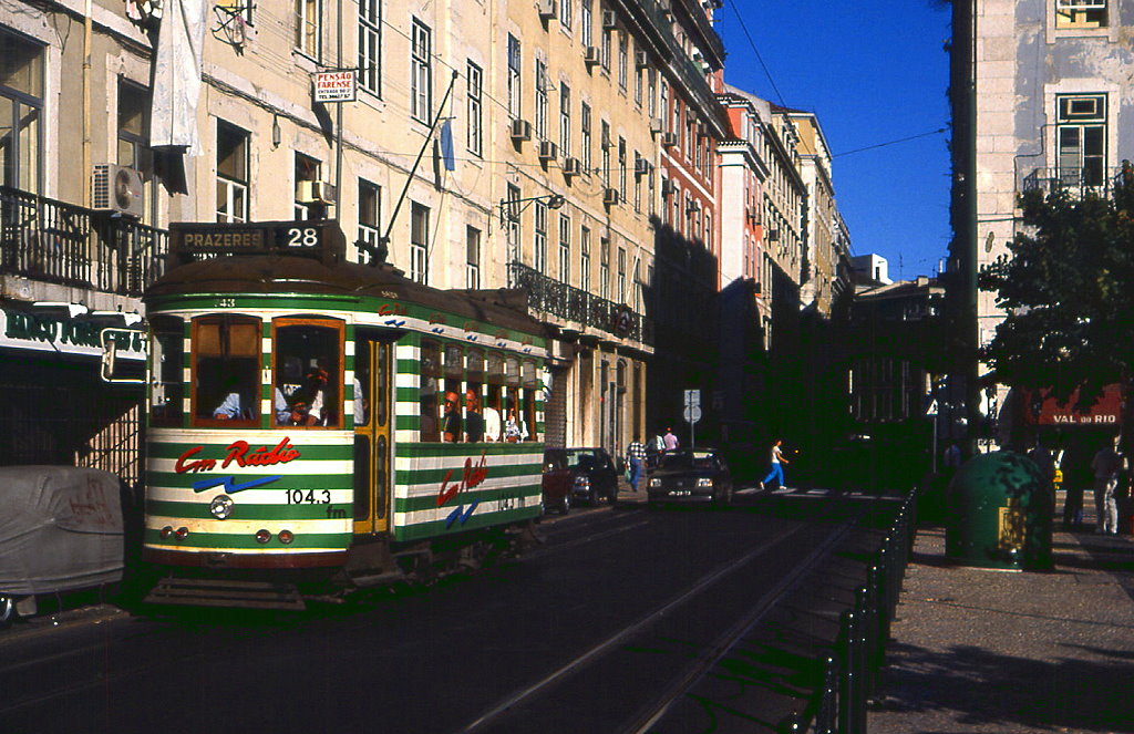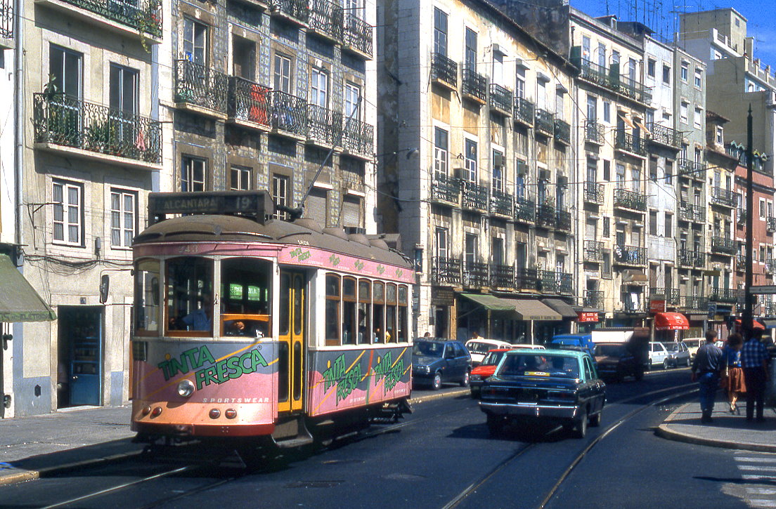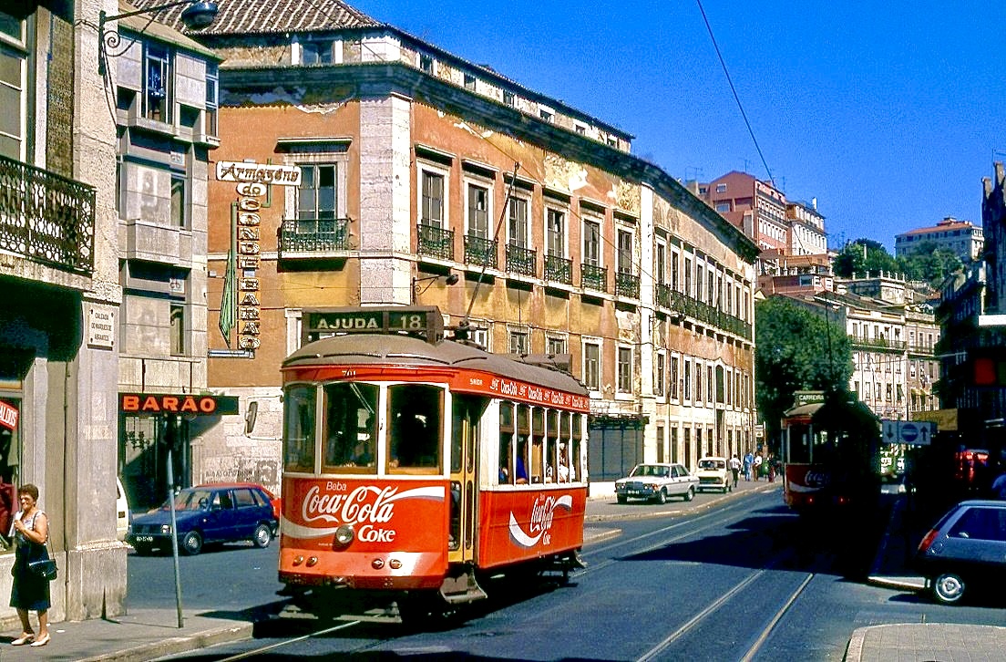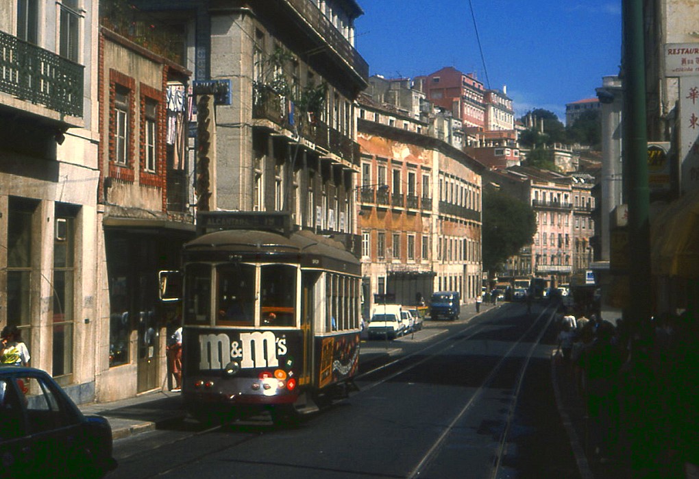Lissabon Tw 706, Rua do Alecrim, 11.09.1990. Wagenpark und Streckennetz waren 1991 noch bunt und vielfältig - obwohl seit meinem Besuch dort ein Jahr zuvor etwa 1/3 des Netzes eingestellt wurde. Die Wagen hatten meist eine Ganzreklame, besassen noch Rollenstromabnehmer und hatten ender der 80er moderne Türen bekommen.