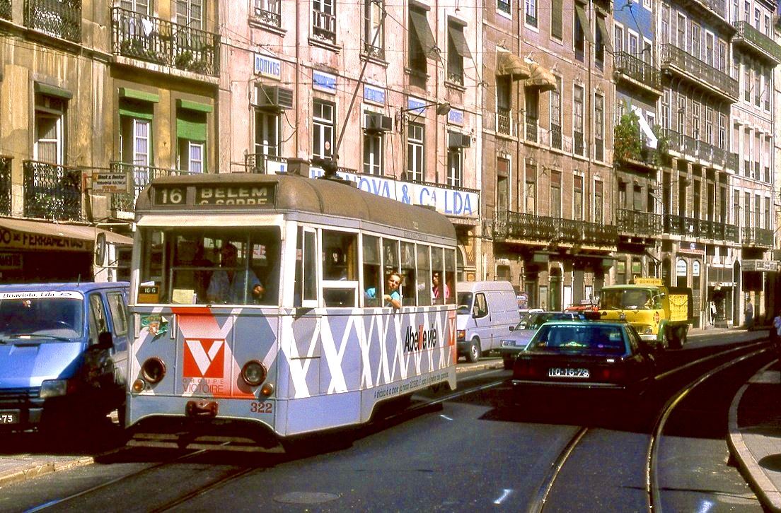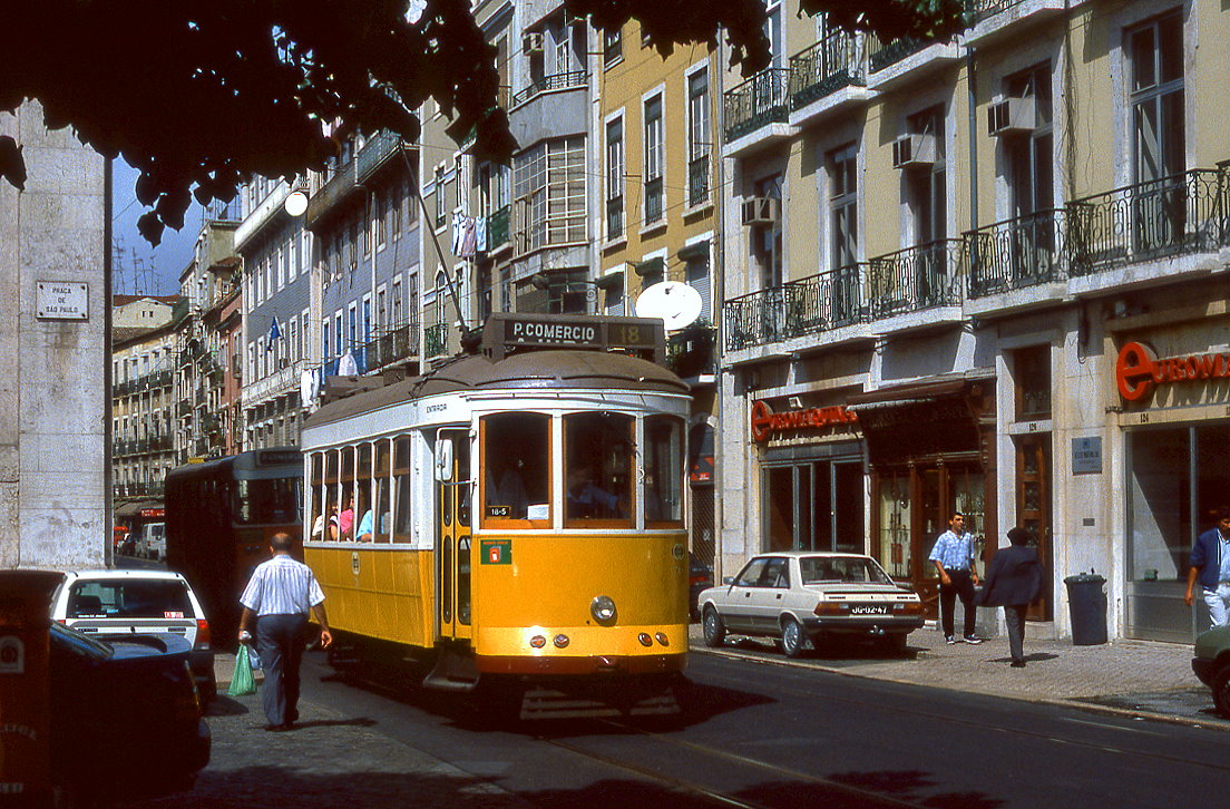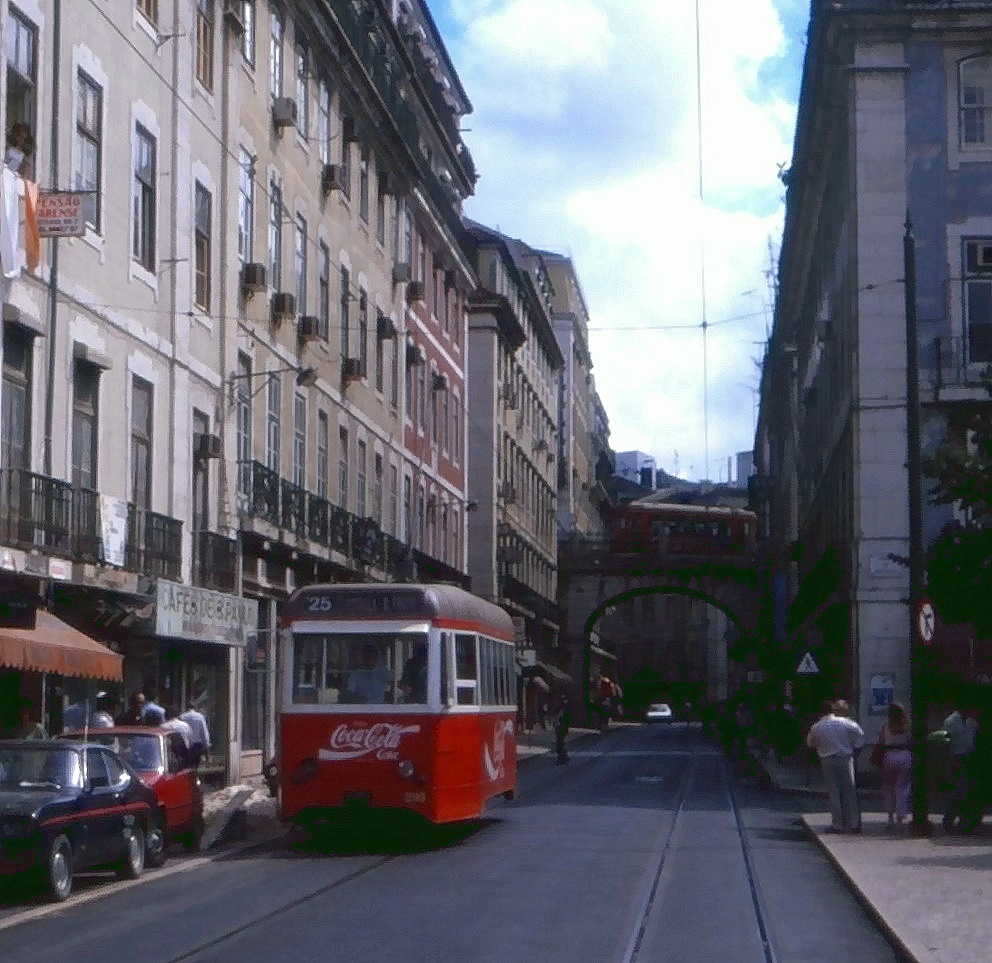 Lissabon Tw 299 in der Rua da Sao Paulo, im Hintergrund kreuzt ein Tw im Verlauf der Rua Alecrim, 12.09.1990.