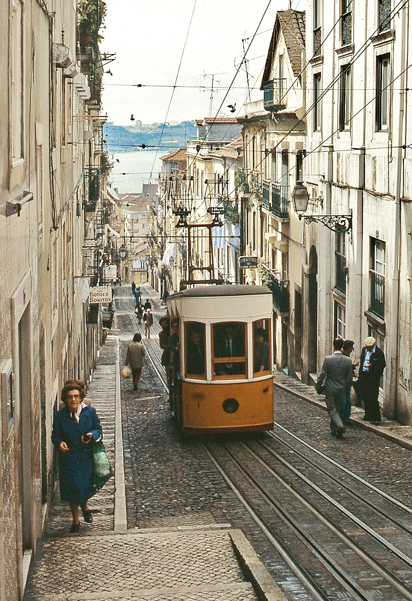 Durch die enge Rua dos dos Negros windet sich der Standardtriebwagen 724 im April 1984. Die Delle an der Front zeigt, dass es dabei ab und zu auch zu  Berührungen  kommt.