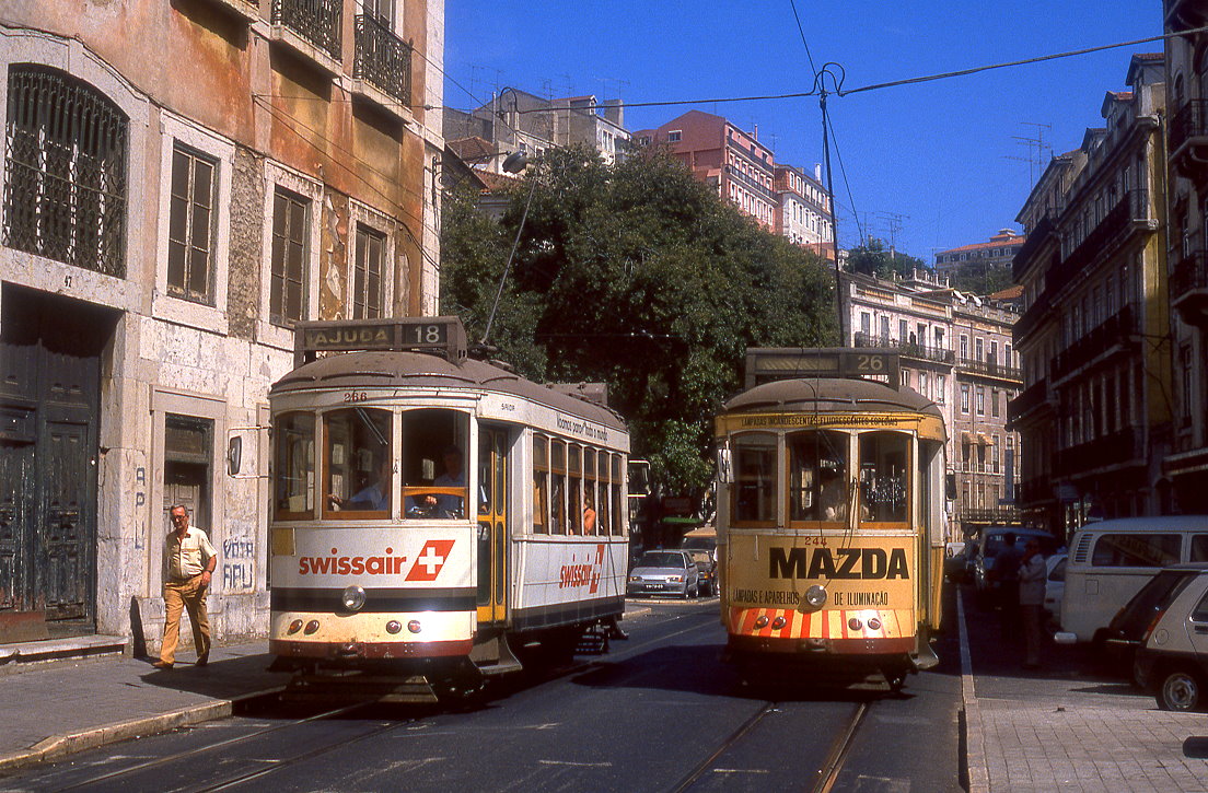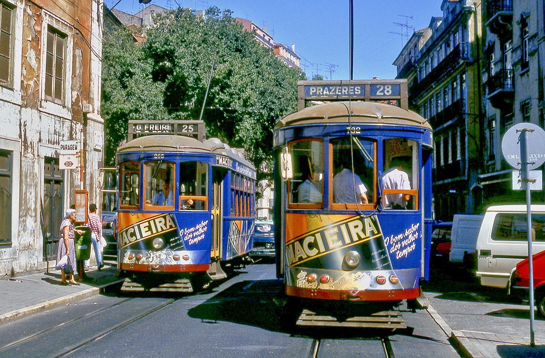 Lissabon Tw 265 und 732 begegnen sich am Largo do Conde Barao, 09.09.1991.