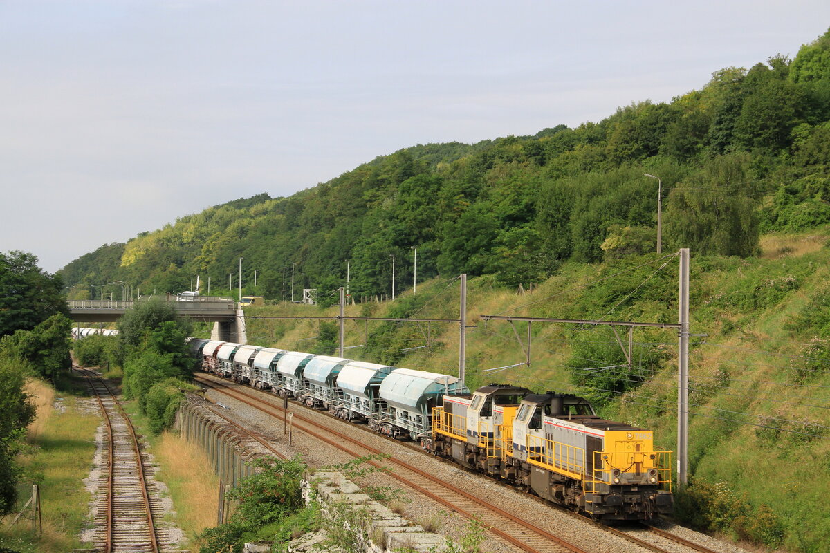 Belgiën Loks 7862+7859 vom SNCB ziehen einem Kalkzug, in ...