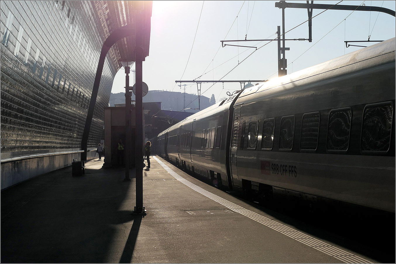 ... weicht ein Neubau am nördlichen Gleis von Zürich HB zurück um dem Bahnsteig Platz zu lassen.