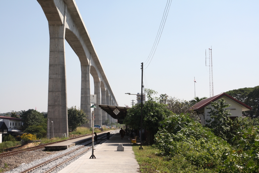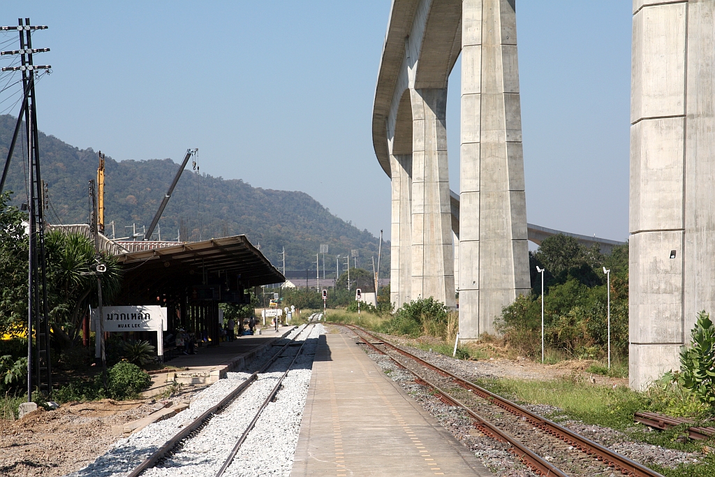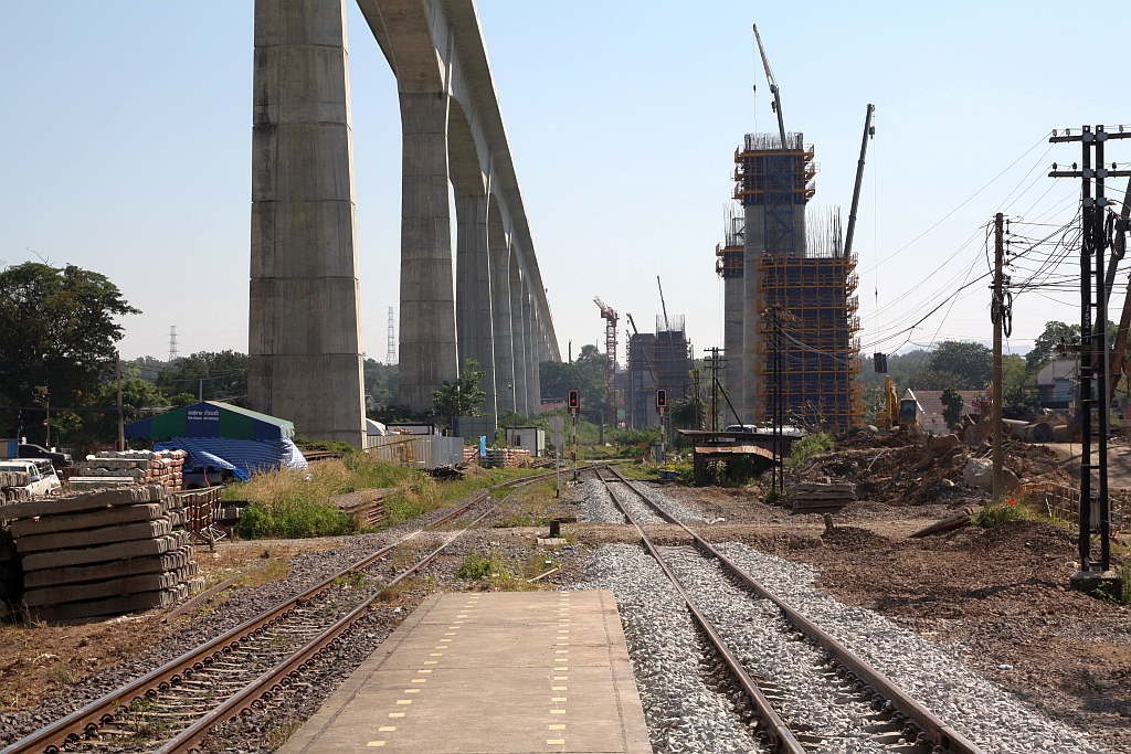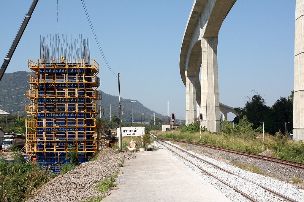 Muak Lek Station am 03.Dezember 2025: rechts das 48m hohe und 4,8Km lange SRT Muak Lek Viadukt, in der Mitte die Trasse der SRT Northeastern Line und links die in Bau befindliche SRTET HSR Northeastern Line. Karl Seltenhammer