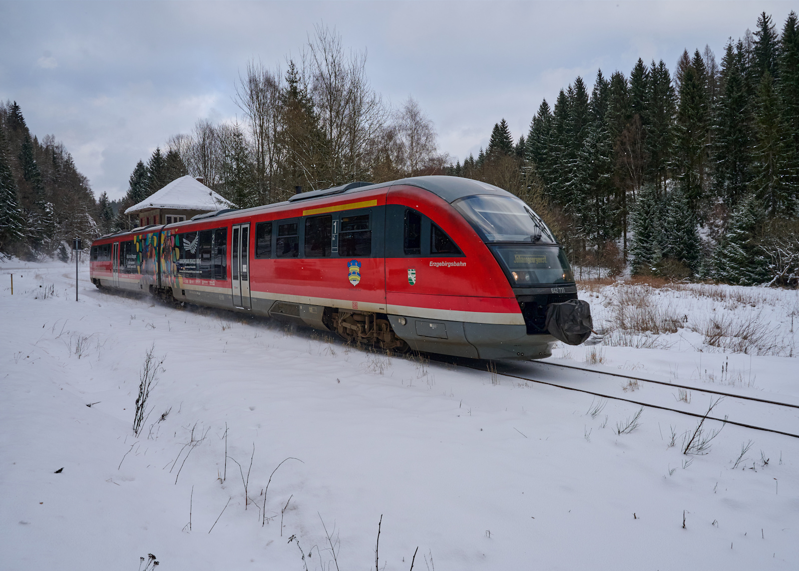 Das ehemalige Stellwerk in Georgenthal ist seit mehr als 50 Jahren außer Betrieb. Einst zweigte hier ein Anschlussgleis der Wismut ab, die in den 1950er Jahren für erhebliches Verkehrsaufkommen auf der Strecke Schwarzenberg - Johanngeorgenstadt sorgte und den zweigleisigen Ausbau erforderlich machte. Dieser Boom dauerte nur wenige Jahre. Am 02.01.2026 fuhr 642 231 als RB 21989 am Stellwerk vorbei in Richtung Johanngeorgenstadt. Michael Brunsch