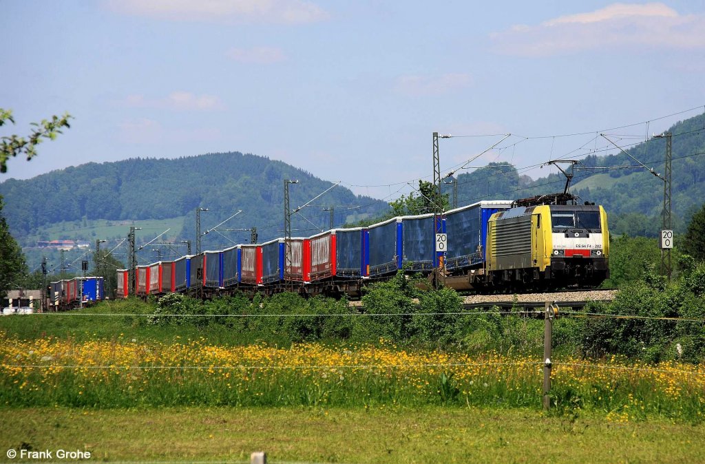 185 125-2 mit einem KLV Richtung Norden an der BK Basheide. Aufgenommen am 25.05.2012 bei Rheinstetten.