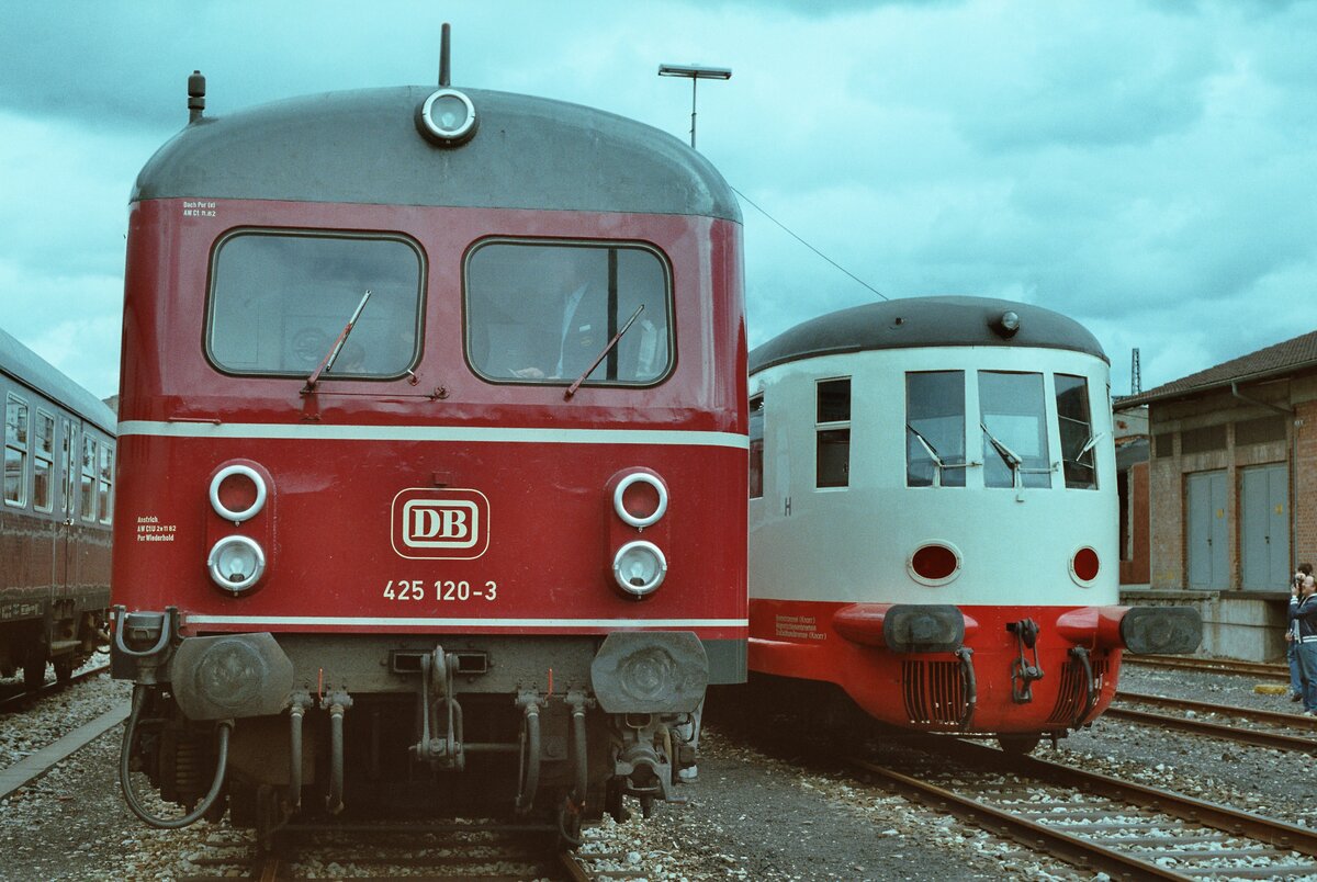 Sonderveranstaltung auf dem Areal des früheren Containerbahnhofs Stuttgart: Vorortzug 425 120-3 (DB) und neben ihm ET 11 01 (DR).