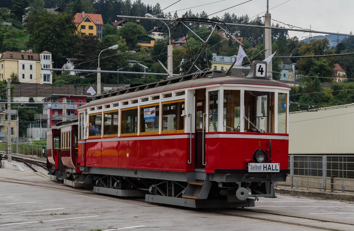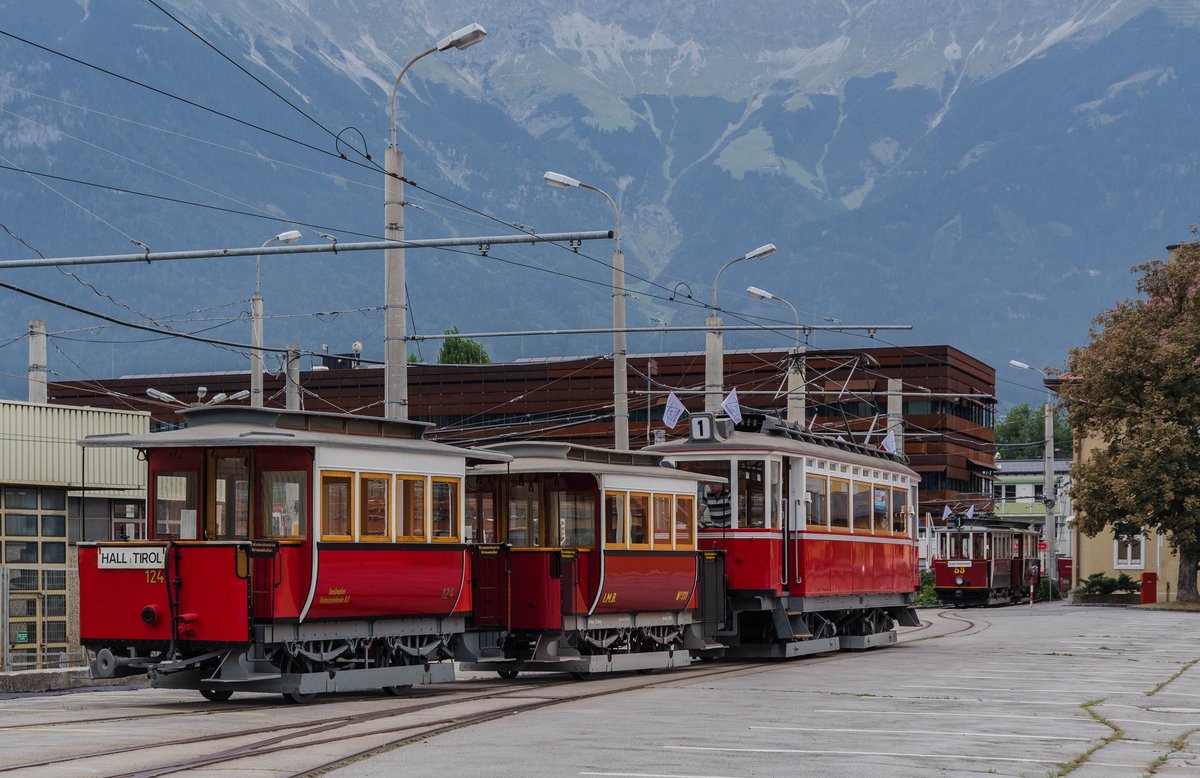 Eine sehr schöne Aufnahme der beiden Museumsbeiwagen 111 und 124 und des Tw 1 mit der beeindruckenden Gebirgslandschaft im Hintergrund.