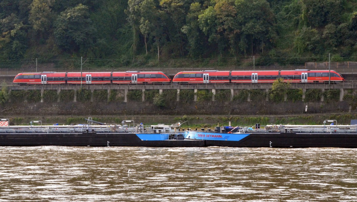 Ein Diesel-Talent der Baureihe 643 in Traktion auf der gegenüberliegenden Rheinseite bei Unkel beobachtet am 21.09.2013 (to the image)