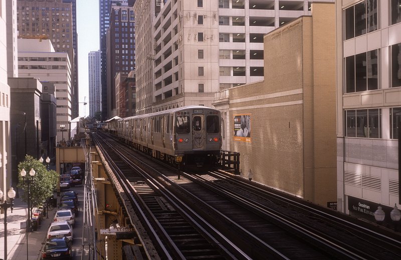 ein faszinierendes Bild der silbrigen Bahn (Metro?) zwischen den tiefen Häuserschluchten.