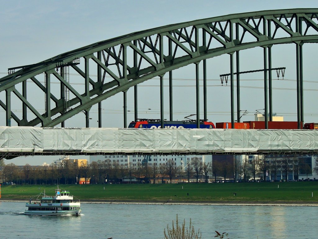 eigendlich war es fast ein Frustbild was ich da gemacht habe. Ich war mit Stefan auf der Südbrücke um dort festzustellen, das man dort überhaupt nicht fotografieren kann. Als wir dann anschließend auf unsere Strassenbahn gewartet haben um nach Bonn zu fahren, zog die 482er der SBB den Containerzug über die Brücke. Auf dem Rechner zu Hause entdeckte ich erst den Reiz des Bildes mit dem Schiff und der verhangenen Brücke, die mich sofort an Christo erinnerte. Nun freue ich mich natürlich umsomehr das nicht nur ich gefallen an dem Bild habe.