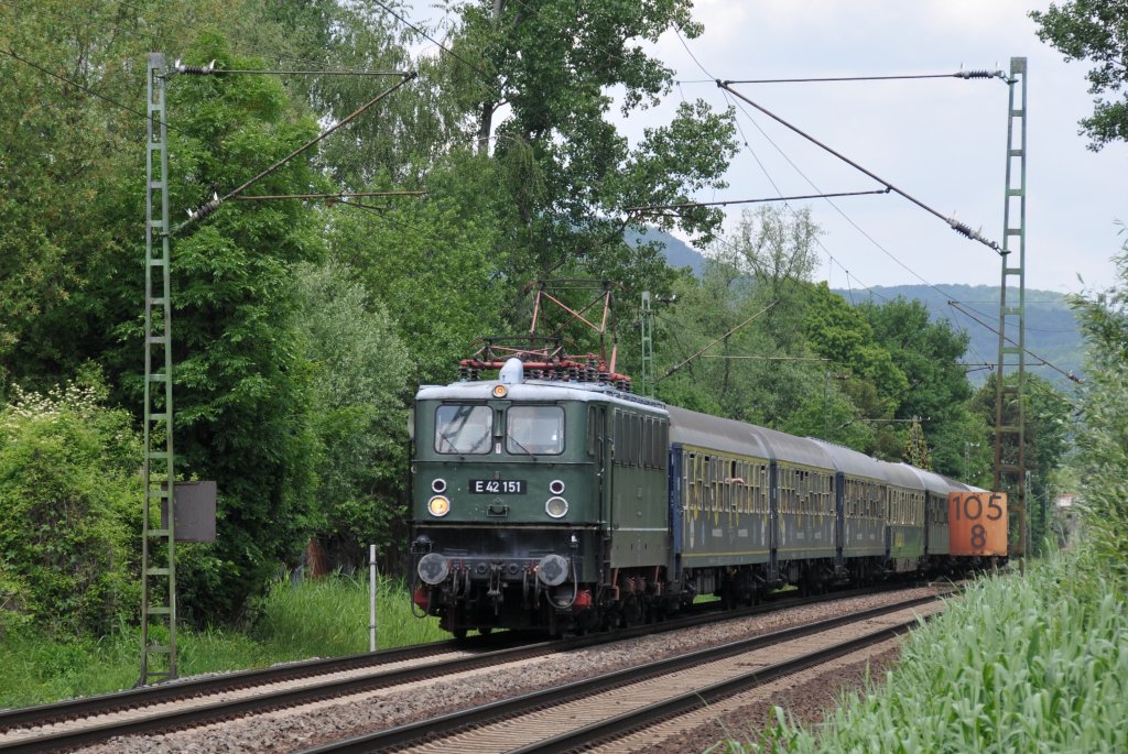 E42 151 zog am 13/05/2011 einen Sonderzug bei Unkel rheinabwärts. (to the image)