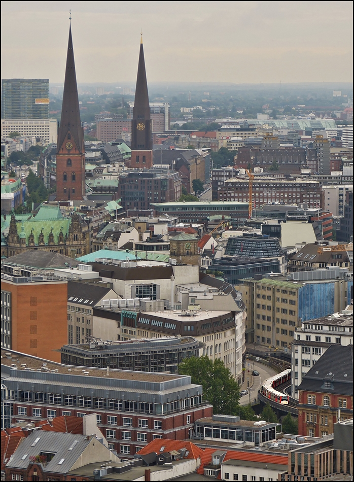 . Suche den Zug – Von der Turmplattform (106 m) des Michel hat man eine wunderschöne Aussicht auf die Stadt Hamburg. Ein Zug der Hamburger Hochbahn hat die Station Rödingsmarkt soeben verlassen und schlängelt sich durch die Häuserschluchten, kurz bevor er im Untergrund verschwindet, um zur Station Rathaus zu gelangen. 21.09.2013 (Jeanny) (to the image)