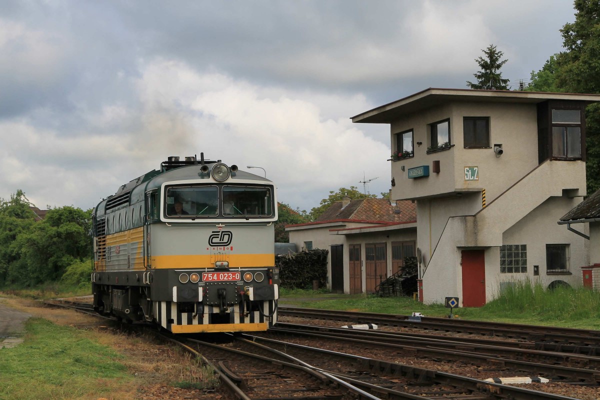 Während eine Regenschauer fahrt 754 075-0 mit R 661 Plzeň-Brno Hlavní Nádra¸ídurch Okří¨ky am 29-5-2013. (to the image)