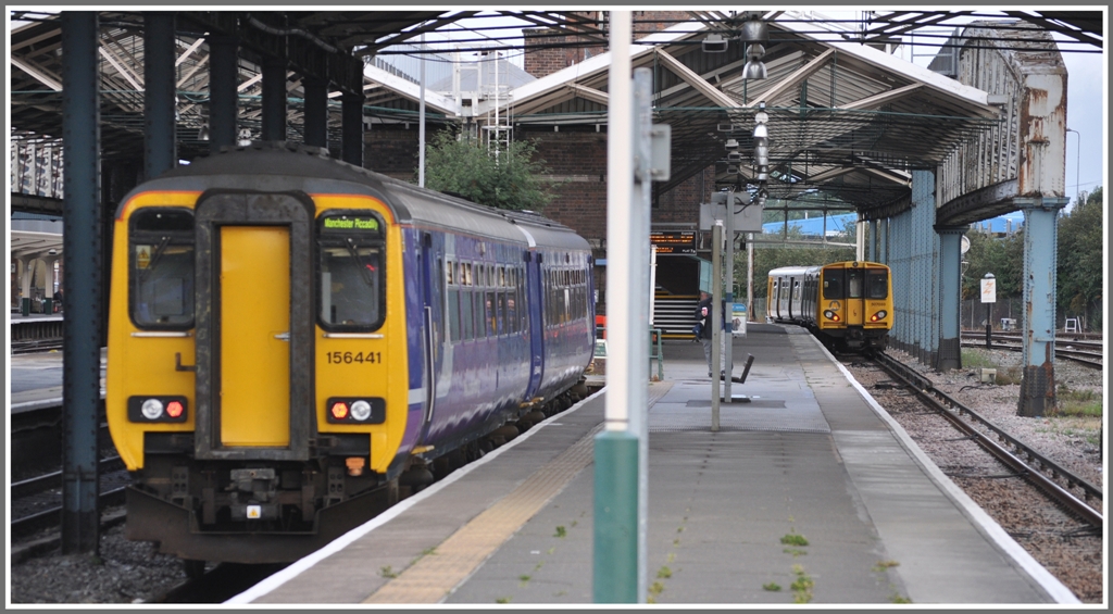 @Stefan: Der Zug hinten rechts ist eigentlich die U-Bahn von Liverpool und fährt viertelstündlich ab dem Platz wo er jetzt steht über Land nach Birkenhead und dann unterirdisch unter dem River Mersey hindurch nach Liverpool und bedient dort als Ringlinie verschiedene Bahnhöfe.