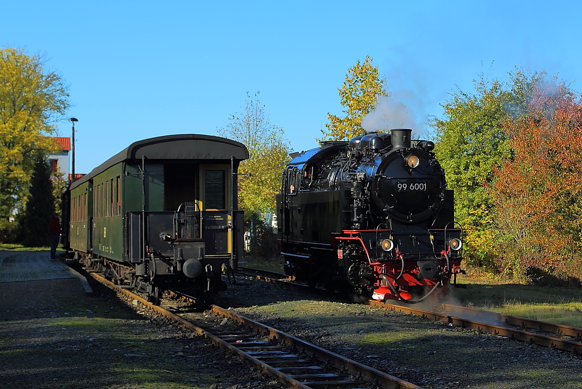 99 6001 am 19.10.2014 beim Umsetzen im Bahnhof Harzgerode. Danach wird sie noch die kurz vorher, von 99 5906 mit dem anderen Sonderzug dieses Tages, hier hinterstellten Güterwagen übernehmen, bevor es dann zurück nach Alexisbad geht. (to the image)
