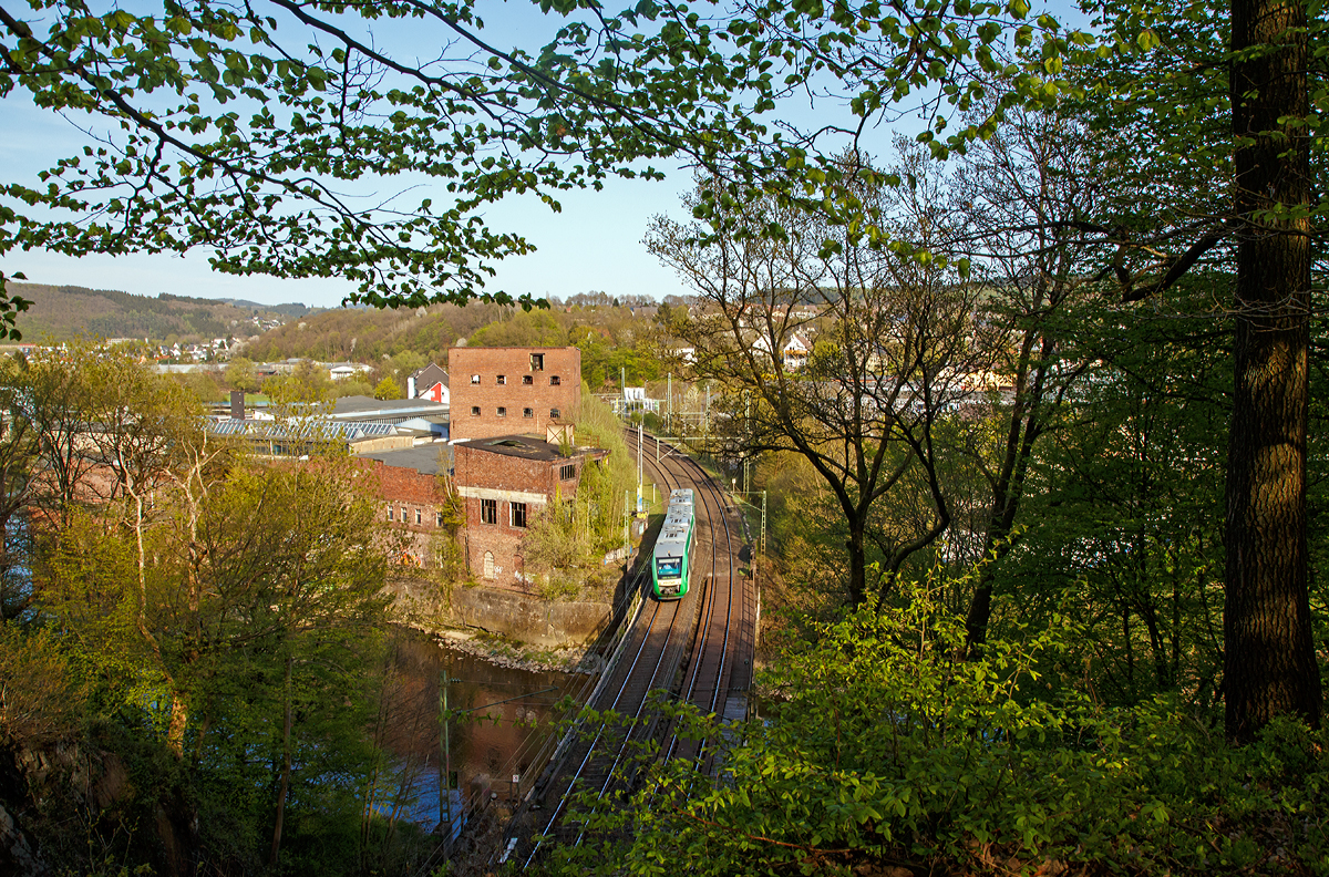 Der VT 254 (95 80 0648 154-2 D-HEB / 95 80 0648 654-1 D-HEB) ein Alstom Coradia LINT 41 der HLB (Hessische Landesbahn), ex Vectus VT 254, hat am 24.04.2015 den Bf Scheuerfeld/Sieg verlassen und fährt nun als RB 95 "Sieg-Dill-Bahn" (Dillenburg - Siegen - Au/Sieg) weiter in Richtung Au/Sieg, hier überquert gleich die Sieg, bevor es durch den 32 m langen Mühlburg-Tunnel geht. (to the image)
